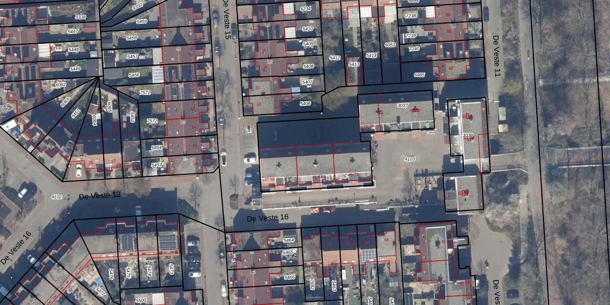 Het perceel waarop De Veste 16 41-B staat heeft een oppervlakte van 1113 m². Dit is een zeer groot perceel. De perceeloppervlakte wordt geregistreerd door het Kadaster. Gedetailleerde informatie over de maten van dit perceel kunt u vinden in het rapport Kadastrale kaart met maatvoering van De Veste 16 41-B.