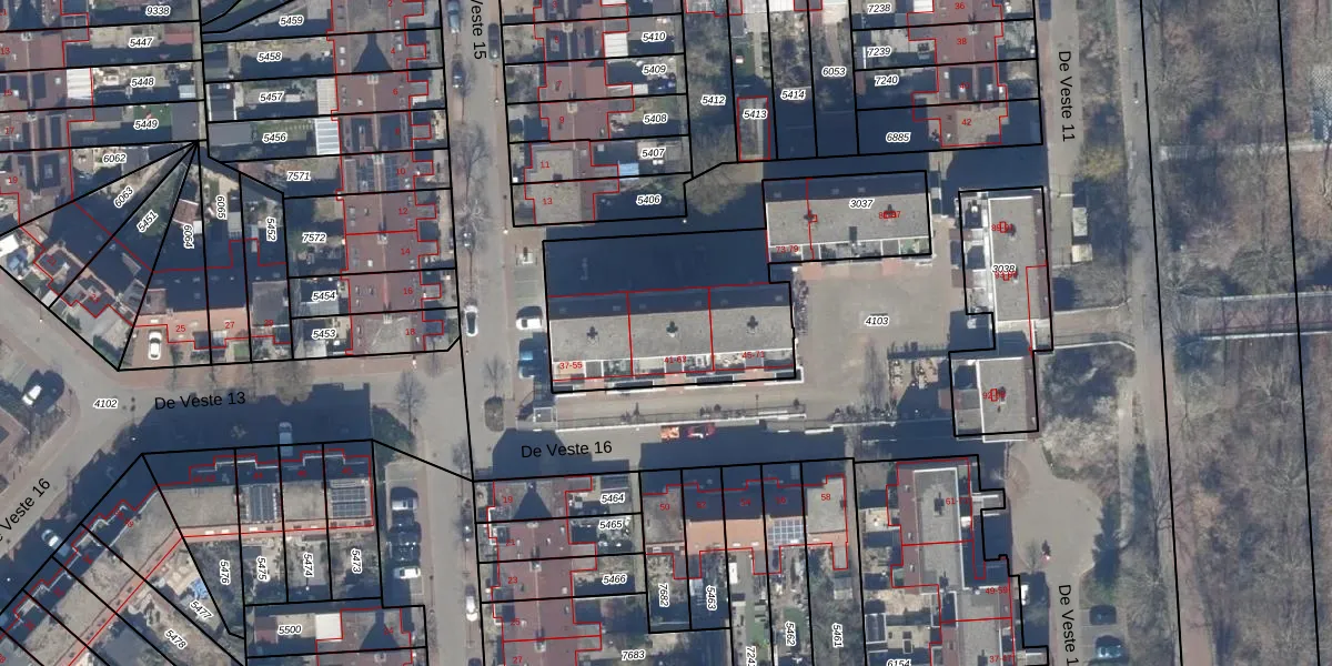 Het perceel waarop De Veste 16 57 staat heeft een oppervlakte van 1113 m². Dit is een zeer groot perceel. De perceeloppervlakte wordt geregistreerd door het Kadaster. Gedetailleerde informatie over de maten van dit perceel kunt u vinden in het rapport Kadastrale kaart met maatvoering van De Veste 16 57.