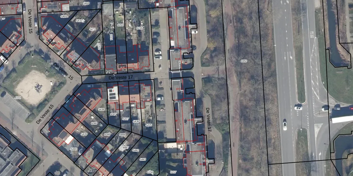 Het perceel waarop De Veste 17 12 staat heeft een oppervlakte van 1896 m². Dit is een zeer groot perceel. De perceeloppervlakte wordt geregistreerd door het Kadaster. Gedetailleerde informatie over de maten van dit perceel kunt u vinden in het rapport Kadastrale kaart met maatvoering van De Veste 17 12.