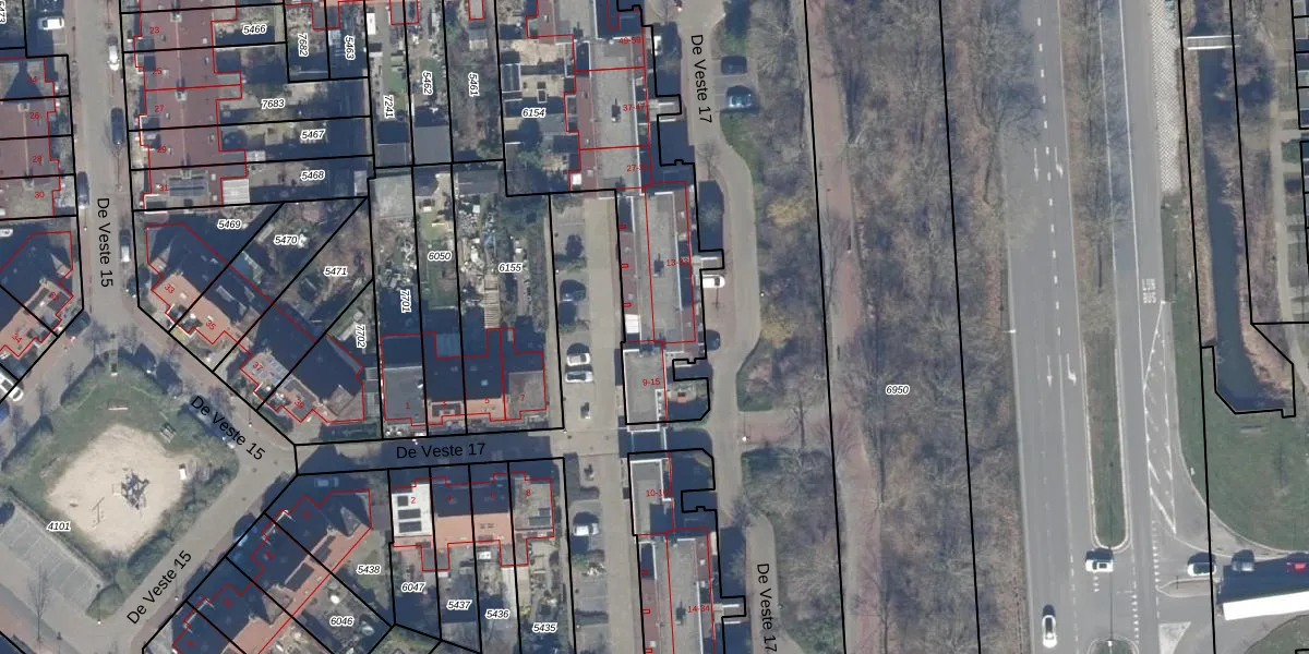 Het perceel waarop De Veste 17 13 staat heeft een oppervlakte van 1411 m². Dit is een zeer groot perceel. De perceeloppervlakte wordt geregistreerd door het Kadaster. Gedetailleerde informatie over de maten van dit perceel kunt u vinden in het rapport Kadastrale kaart met maatvoering van De Veste 17 13.