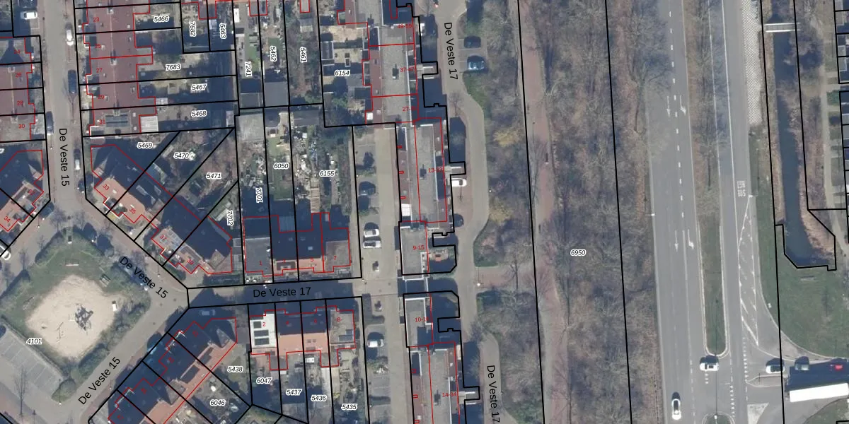 Het perceel waarop De Veste 17 17 staat heeft een oppervlakte van 1411 m². Dit is een zeer groot perceel. De perceeloppervlakte wordt geregistreerd door het Kadaster. Gedetailleerde informatie over de maten van dit perceel kunt u vinden in het rapport Kadastrale kaart met maatvoering van De Veste 17 17.