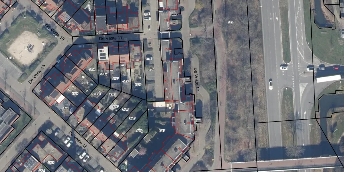Het perceel waarop De Veste 17 22 staat heeft een oppervlakte van 1896 m². Dit is een zeer groot perceel. De perceeloppervlakte wordt geregistreerd door het Kadaster. Gedetailleerde informatie over de maten van dit perceel kunt u vinden in het rapport Kadastrale kaart met maatvoering van De Veste 17 22.