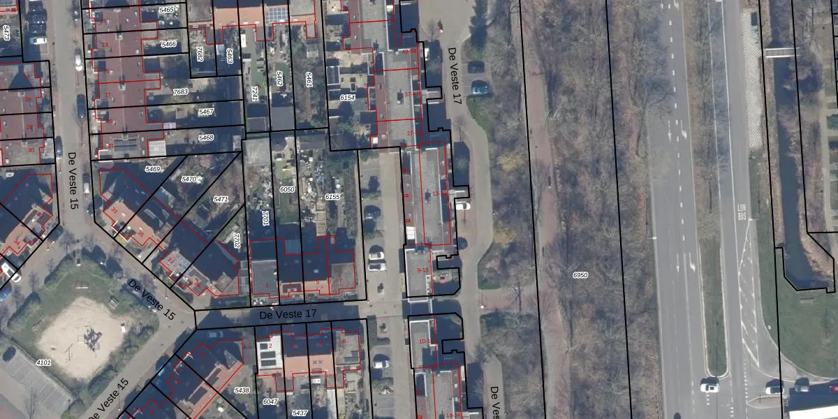 Het perceel waarop De Veste 17 23 staat heeft een oppervlakte van 1411 m². Dit is een zeer groot perceel. De perceeloppervlakte wordt geregistreerd door het Kadaster. Gedetailleerde informatie over de maten van dit perceel kunt u vinden in het rapport Kadastrale kaart met maatvoering van De Veste 17 23.