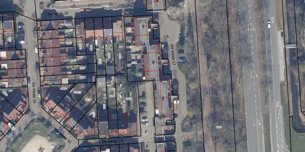 Het perceel waarop De Veste 17 27 staat heeft een oppervlakte van 1411 m². Dit is een zeer groot perceel. De perceeloppervlakte wordt geregistreerd door het Kadaster. Gedetailleerde informatie over de maten van dit perceel kunt u vinden in het rapport Kadastrale kaart met maatvoering van De Veste 17 27.