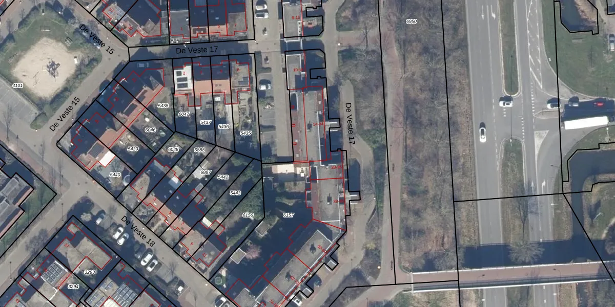 Het perceel waarop De Veste 17 30 staat heeft een oppervlakte van 1896 m². Dit is een zeer groot perceel. De perceeloppervlakte wordt geregistreerd door het Kadaster. Gedetailleerde informatie over de maten van dit perceel kunt u vinden in het rapport Kadastrale kaart met maatvoering van De Veste 17 30.