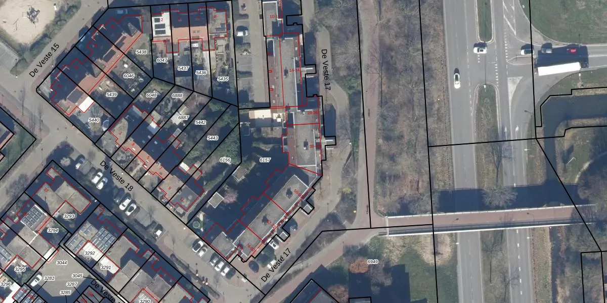 Het perceel waarop De Veste 17 40 staat heeft een oppervlakte van 1896 m². Dit is een zeer groot perceel. De perceeloppervlakte wordt geregistreerd door het Kadaster. Gedetailleerde informatie over de maten van dit perceel kunt u vinden in het rapport Kadastrale kaart met maatvoering van De Veste 17 40.