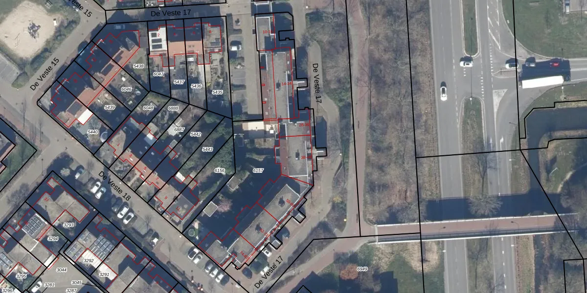 Het perceel waarop De Veste 17 42 staat heeft een oppervlakte van 1896 m². Dit is een zeer groot perceel. De perceeloppervlakte wordt geregistreerd door het Kadaster. Gedetailleerde informatie over de maten van dit perceel kunt u vinden in het rapport Kadastrale kaart met maatvoering van De Veste 17 42.