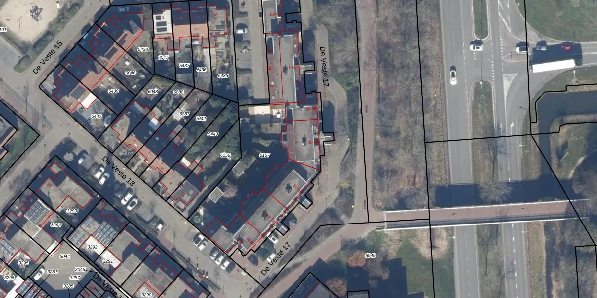 Het perceel waarop De Veste 17 48 staat heeft een oppervlakte van 1896 m². Dit is een zeer groot perceel. De perceeloppervlakte wordt geregistreerd door het Kadaster. Gedetailleerde informatie over de maten van dit perceel kunt u vinden in het rapport Kadastrale kaart met maatvoering van De Veste 17 48.