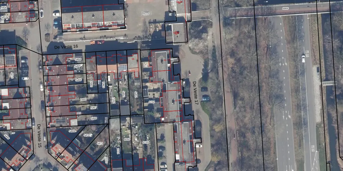 Het perceel waarop De Veste 17 49 staat heeft een oppervlakte van 1411 m². Dit is een zeer groot perceel. De perceeloppervlakte wordt geregistreerd door het Kadaster. Gedetailleerde informatie over de maten van dit perceel kunt u vinden in het rapport Kadastrale kaart met maatvoering van De Veste 17 49.