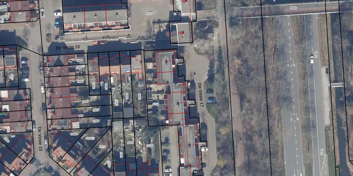 Het perceel waarop De Veste 17 57 staat heeft een oppervlakte van 1411 m². Dit is een zeer groot perceel. De perceeloppervlakte wordt geregistreerd door het Kadaster. Gedetailleerde informatie over de maten van dit perceel kunt u vinden in het rapport Kadastrale kaart met maatvoering van De Veste 17 57.