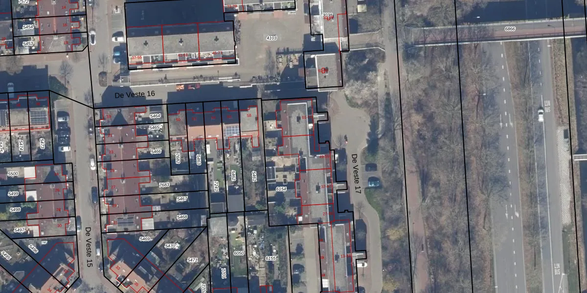 Het perceel waarop De Veste 17 59 staat heeft een oppervlakte van 1411 m². Dit is een zeer groot perceel. De perceeloppervlakte wordt geregistreerd door het Kadaster. Gedetailleerde informatie over de maten van dit perceel kunt u vinden in het rapport Kadastrale kaart met maatvoering van De Veste 17 59.