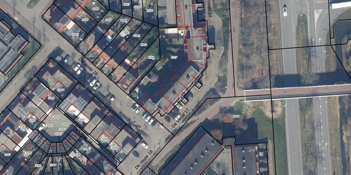 Het perceel waarop De Veste 17 66 staat heeft een oppervlakte van 1896 m². Dit is een zeer groot perceel. De perceeloppervlakte wordt geregistreerd door het Kadaster. Gedetailleerde informatie over de maten van dit perceel kunt u vinden in het rapport Kadastrale kaart met maatvoering van De Veste 17 66.