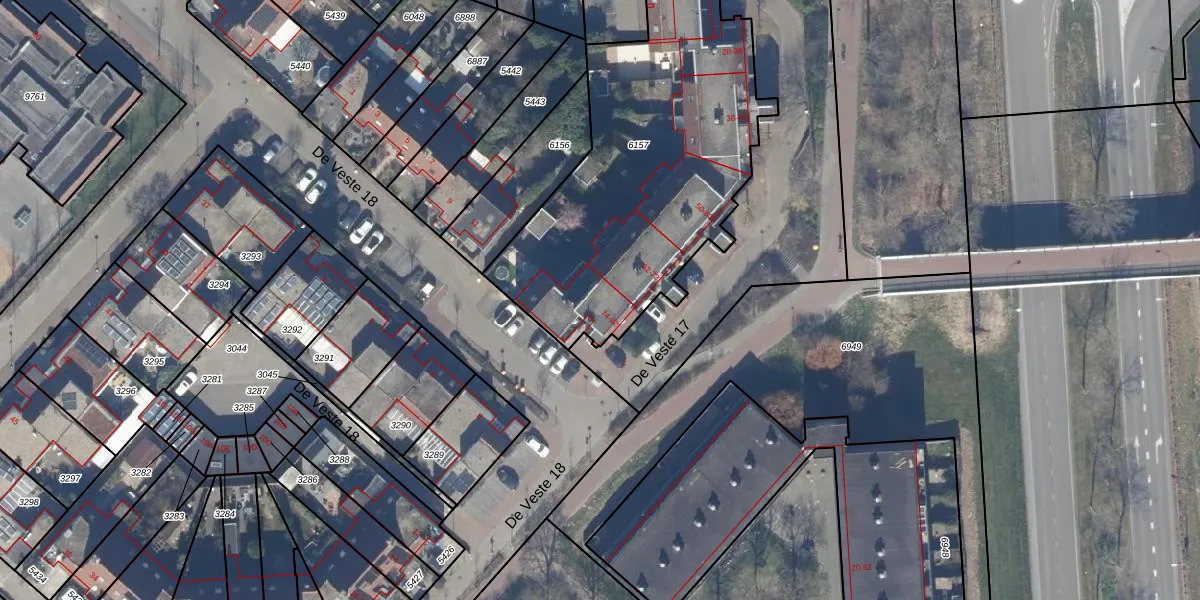 Het perceel waarop De Veste 17 74 staat heeft een oppervlakte van 1896 m². Dit is een zeer groot perceel. De perceeloppervlakte wordt geregistreerd door het Kadaster. Gedetailleerde informatie over de maten van dit perceel kunt u vinden in het rapport Kadastrale kaart met maatvoering van De Veste 17 74.