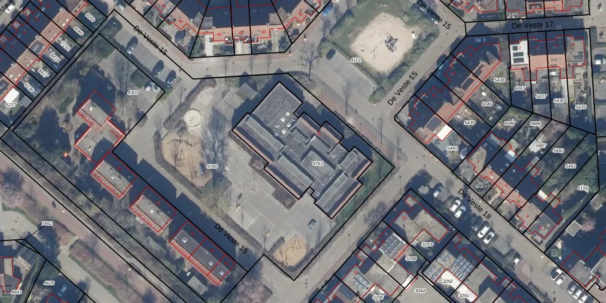 Het perceel waarop De Veste 18 40 staat heeft een oppervlakte van 960 m². Dit is een groot perceel. De perceeloppervlakte wordt geregistreerd door het Kadaster. Gedetailleerde informatie over de maten van dit perceel kunt u vinden in het rapport Kadastrale kaart met maatvoering van De Veste 18 40.