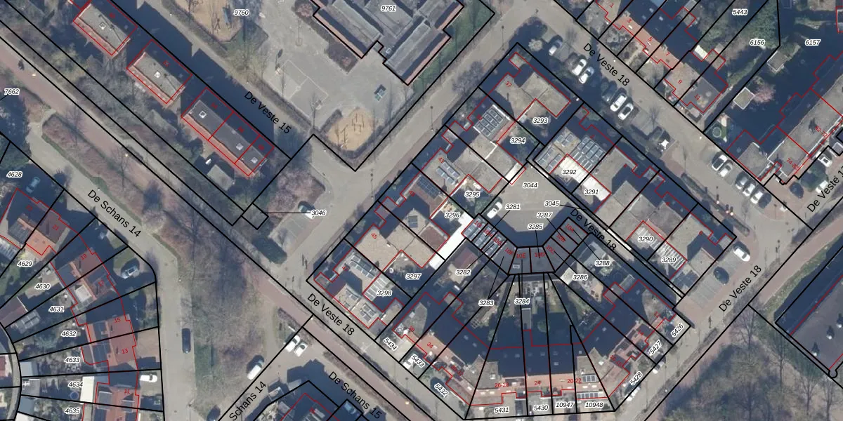 Het perceel waarop De Veste 18 43 staat heeft een oppervlakte van 272 m². Dit is een middelgroot perceel. De perceeloppervlakte wordt geregistreerd door het Kadaster. Gedetailleerde informatie over de maten van dit perceel kunt u vinden in het rapport Kadastrale kaart met maatvoering van De Veste 18 43.