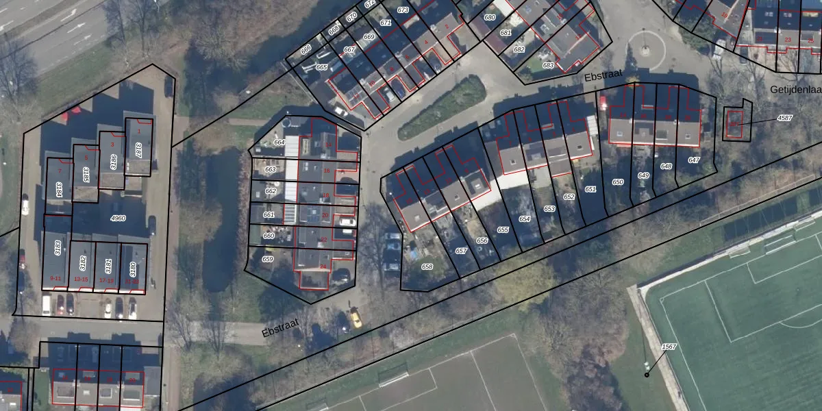 Het perceel waarop Ebstraat 15 staat heeft een oppervlakte van 280 m². Dit is een middelgroot perceel. De perceeloppervlakte wordt geregistreerd door het Kadaster. Gedetailleerde informatie over de maten van dit perceel kunt u vinden in het rapport Kadastrale kaart met maatvoering van Ebstraat 15.