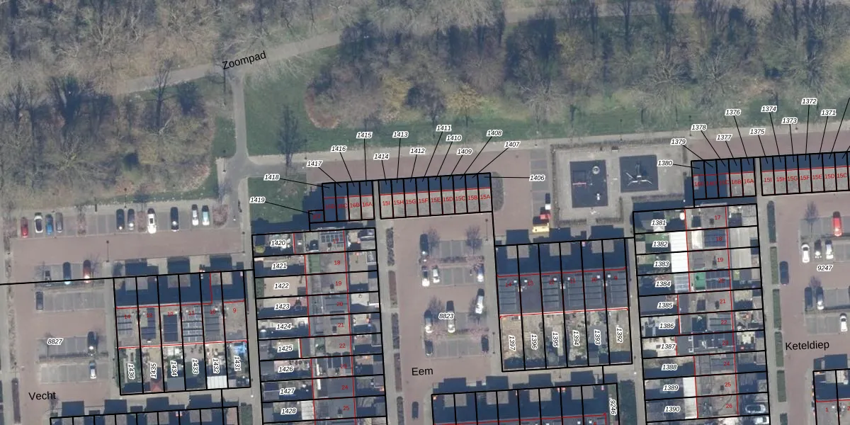 Gebruik de zoekbalk of klik op een perceel voor informatie over de adressen binnen dit perceel.