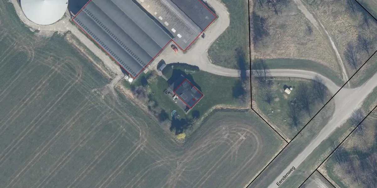 Het perceel waarop Eendenweg 20 staat heeft een oppervlakte van 10,9 ha. Dit is een zeer groot perceel. De perceeloppervlakte wordt geregistreerd door het Kadaster. Gedetailleerde informatie over de maten van dit perceel kunt u vinden in het rapport Kadastrale kaart met maatvoering van Eendenweg 20.