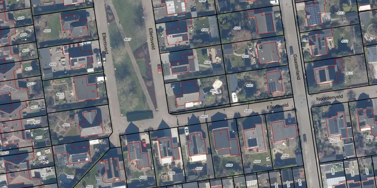 Het perceel waarop Ellertsveld 2 staat heeft een oppervlakte van 528 m². Dit is een groot perceel. De perceeloppervlakte wordt geregistreerd door het Kadaster. Gedetailleerde informatie over de maten van dit perceel kunt u vinden in het rapport Kadastrale kaart met maatvoering van Ellertsveld 2.