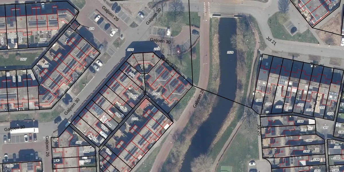 Het perceel waarop Galjoen 28 6 staat heeft een oppervlakte van 510 m². Dit is een groot perceel. De perceeloppervlakte wordt geregistreerd door het Kadaster. Gedetailleerde informatie over de maten van dit perceel kunt u vinden in het rapport Kadastrale kaart met maatvoering van Galjoen 28 6.