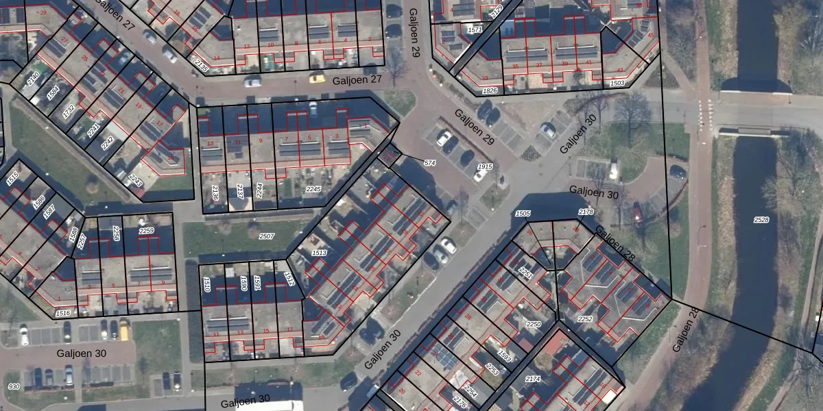 Het perceel waarop Galjoen 30 31 staat heeft een oppervlakte van 970 m². Dit is een groot perceel. De perceeloppervlakte wordt geregistreerd door het Kadaster. Gedetailleerde informatie over de maten van dit perceel kunt u vinden in het rapport Kadastrale kaart met maatvoering van Galjoen 30 31.