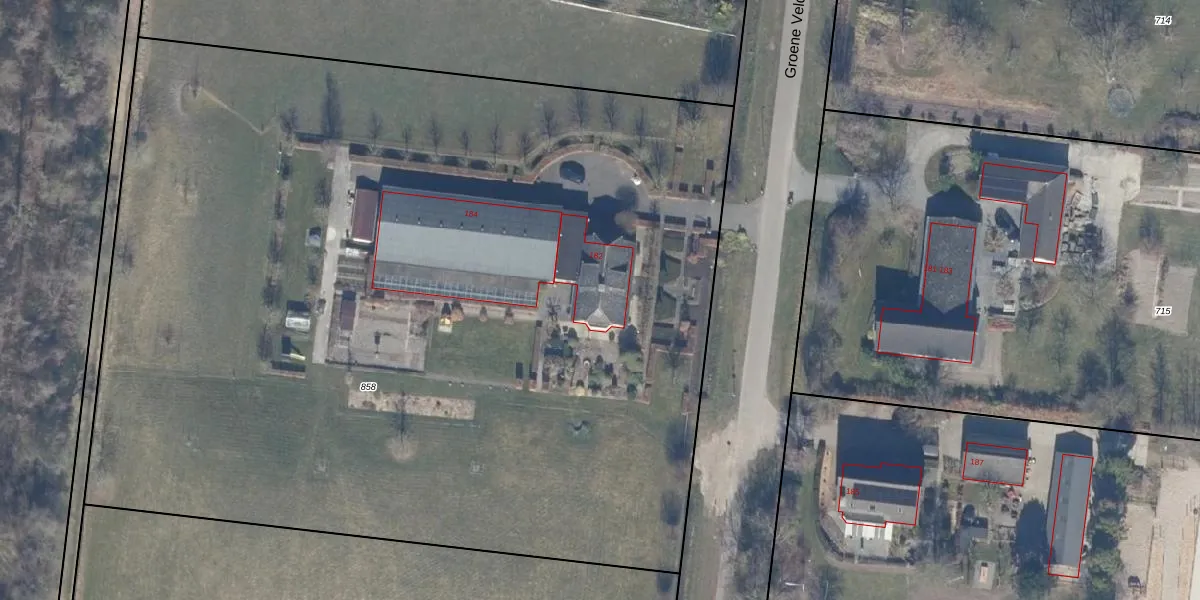 Het perceel waarop Groene Velden 182 staat heeft een oppervlakte van 7840 m². Dit is een zeer groot perceel. De perceeloppervlakte wordt geregistreerd door het Kadaster. Gedetailleerde informatie over de maten van dit perceel kunt u vinden in het rapport Kadastrale kaart met maatvoering van Groene Velden 182.