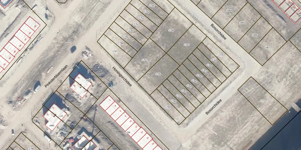 Het perceel waarop Honingorchidee 3 staat heeft een oppervlakte van 347 m². Dit is een groot perceel. De perceeloppervlakte wordt geregistreerd door het Kadaster. Gedetailleerde informatie over de maten van dit perceel kunt u vinden in het rapport Kadastrale kaart met maatvoering van Honingorchidee 3.