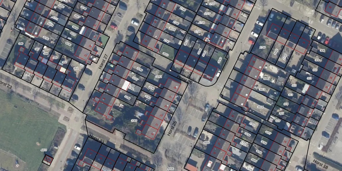 Het perceel waarop Horst 25 29 staat heeft een oppervlakte van 374 m². Dit is een groot perceel. De perceeloppervlakte wordt geregistreerd door het Kadaster. Gedetailleerde informatie over de maten van dit perceel kunt u vinden in het rapport Kadastrale kaart met maatvoering van Horst 25 29.