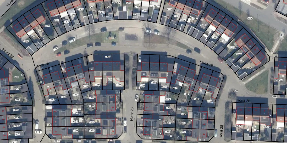 Het perceel waarop Horst 28 29 staat heeft een oppervlakte van 217 m². Dit is een middelgroot perceel. De perceeloppervlakte wordt geregistreerd door het Kadaster. Gedetailleerde informatie over de maten van dit perceel kunt u vinden in het rapport Kadastrale kaart met maatvoering van Horst 28 29.