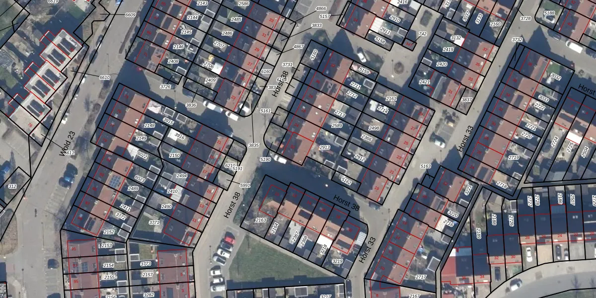 Het perceel waarop Horst 38 22 staat heeft een oppervlakte van 399 m². Dit is een groot perceel. De perceeloppervlakte wordt geregistreerd door het Kadaster. Gedetailleerde informatie over de maten van dit perceel kunt u vinden in het rapport Kadastrale kaart met maatvoering van Horst 38 22.