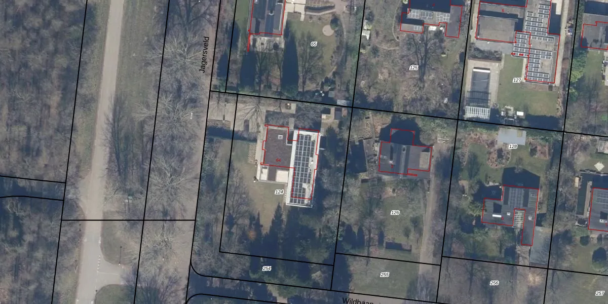 Het perceel waarop Jagersveld 64 staat heeft een oppervlakte van 1985 m². Dit is een zeer groot perceel. De perceeloppervlakte wordt geregistreerd door het Kadaster. Gedetailleerde informatie over de maten van dit perceel kunt u vinden in het rapport Kadastrale kaart met maatvoering van Jagersveld 64.
