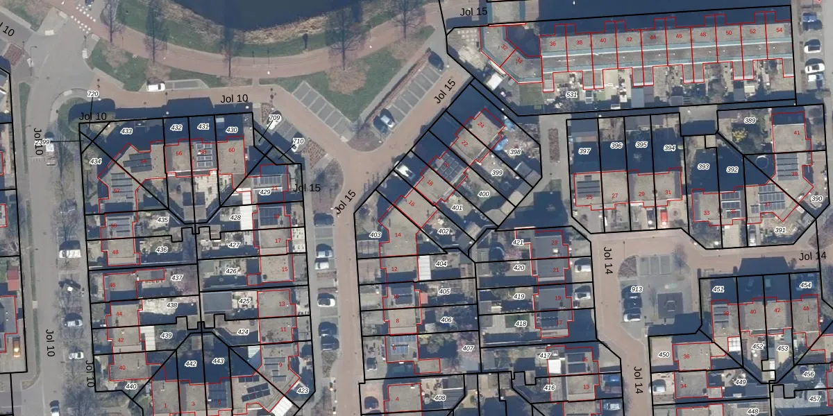 Het perceel waarop Jol 15 16 staat heeft een oppervlakte van 159 m². Dit is een middelgroot perceel. De perceeloppervlakte wordt geregistreerd door het Kadaster. Gedetailleerde informatie over de maten van dit perceel kunt u vinden in het rapport Kadastrale kaart met maatvoering van Jol 15 16.