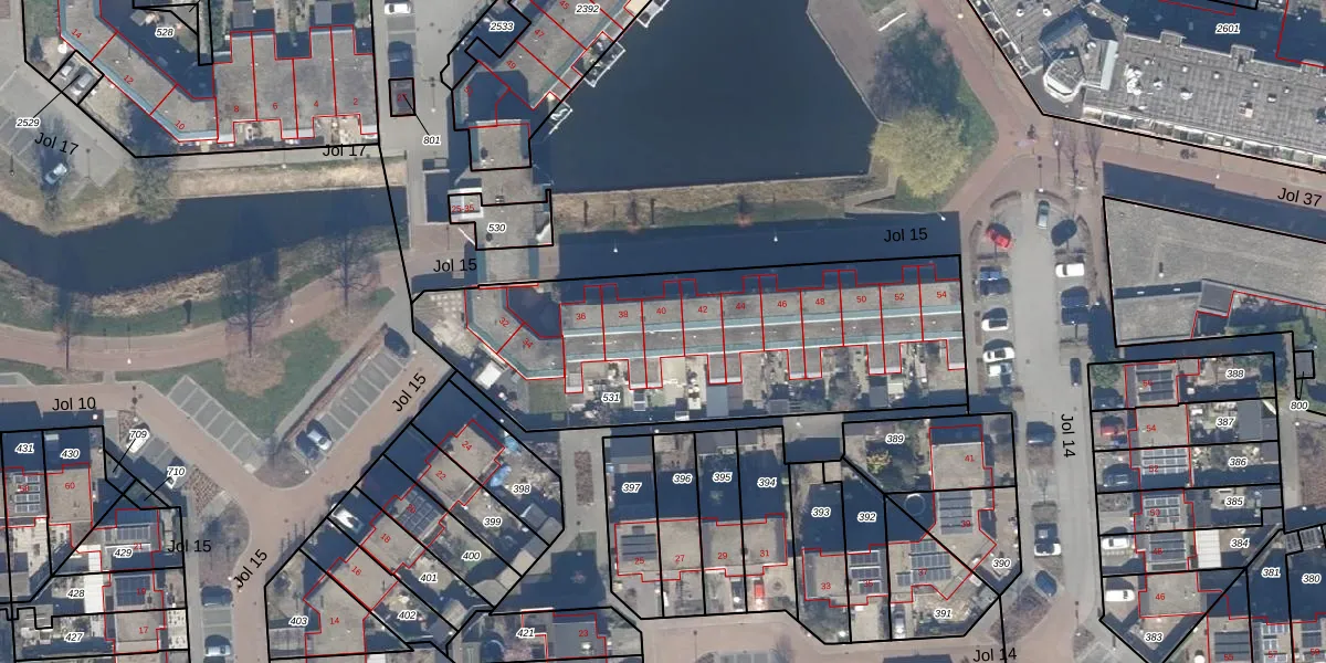 Jol 15 40 is gelegen op kadastraal perceel LLS00N531. Deze kadastrale aanduiding is uniek en wordt gebruikt door het Kadaster om eigendomsrechten en andere zakelijke rechten vast te leggen. Het perceel maakt onderdeel uit van de kadastrale gemeente Lelystad.