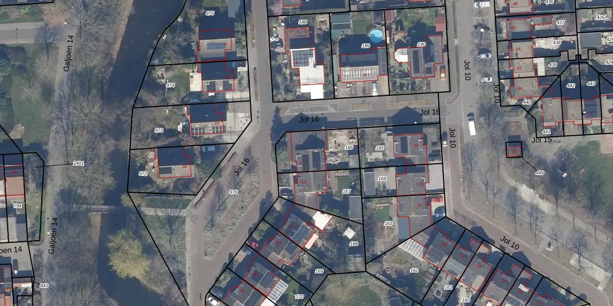 Het perceel waarop Jol 16 17 staat heeft een oppervlakte van 353 m². Dit is een groot perceel. De perceeloppervlakte wordt geregistreerd door het Kadaster. Gedetailleerde informatie over de maten van dit perceel kunt u vinden in het rapport Kadastrale kaart met maatvoering van Jol 16 17.