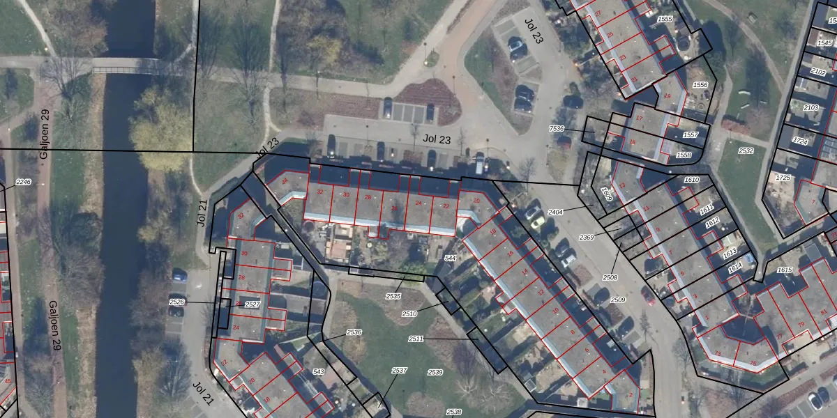 Jol 23 24 is gelegen op kadastraal perceel LLS00N544. Deze kadastrale aanduiding is uniek en wordt gebruikt door het Kadaster om eigendomsrechten en andere zakelijke rechten vast te leggen. Het perceel maakt onderdeel uit van de kadastrale gemeente Lelystad.