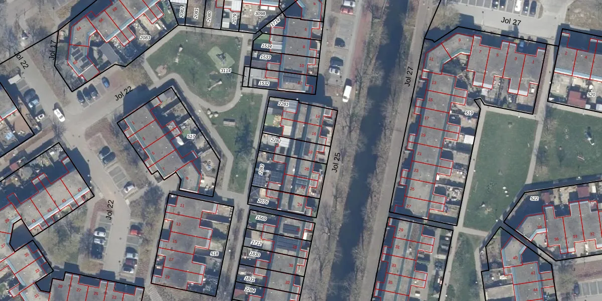 Jol 25 18 is gelegen op kadastraal perceel LLS00N2282. Deze kadastrale aanduiding is uniek en wordt gebruikt door het Kadaster om eigendomsrechten en andere zakelijke rechten vast te leggen. Het perceel maakt onderdeel uit van de kadastrale gemeente Lelystad.