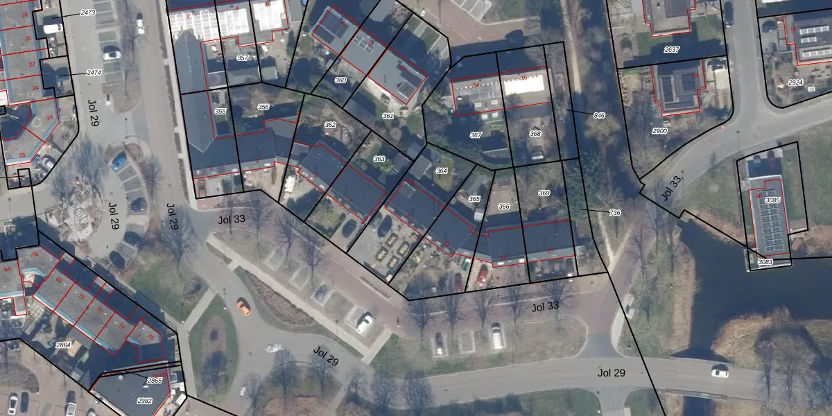Het perceel waarop Jol 33 9 staat heeft een oppervlakte van 433 m². Dit is een groot perceel. De perceeloppervlakte wordt geregistreerd door het Kadaster. Gedetailleerde informatie over de maten van dit perceel kunt u vinden in het rapport Kadastrale kaart met maatvoering van Jol 33 9.