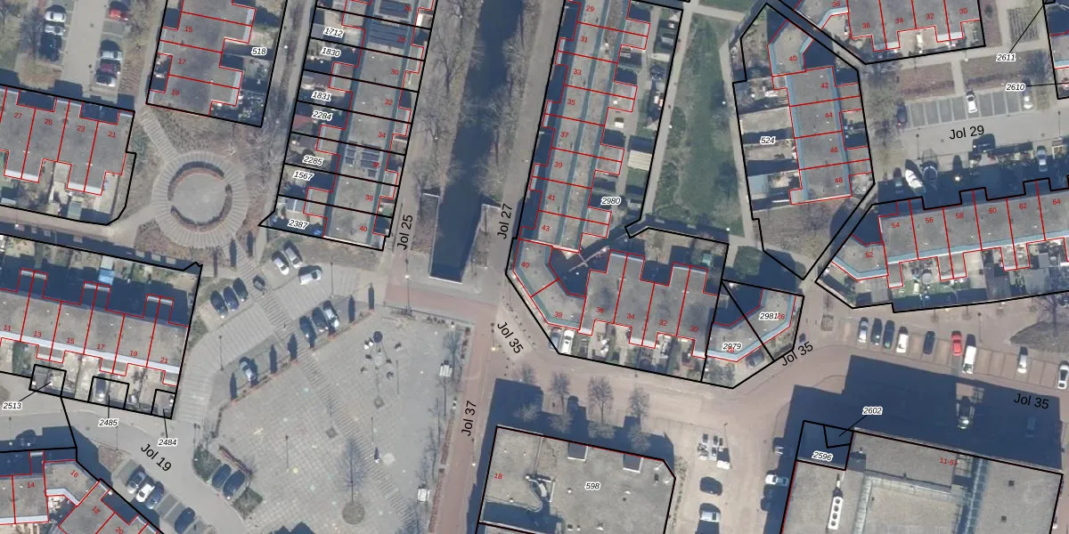 Jol 35 40 is gelegen op kadastraal perceel LLS00N2980. Deze kadastrale aanduiding is uniek en wordt gebruikt door het Kadaster om eigendomsrechten en andere zakelijke rechten vast te leggen. Het perceel maakt onderdeel uit van de kadastrale gemeente Lelystad.