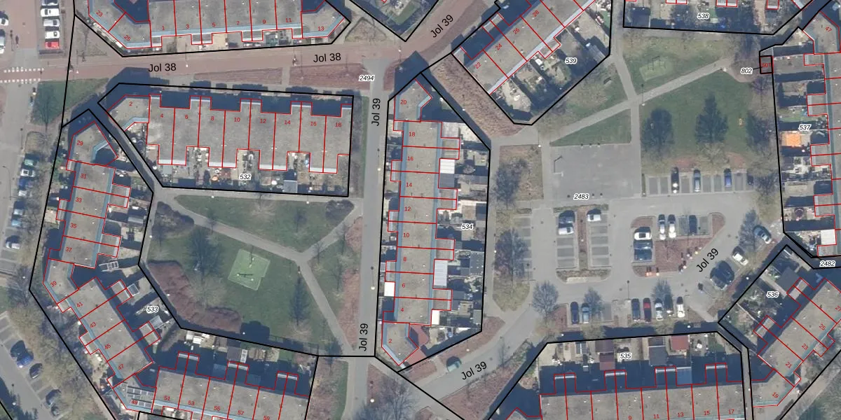 Jol 39 12 is gelegen op kadastraal perceel LLS00N534. Deze kadastrale aanduiding is uniek en wordt gebruikt door het Kadaster om eigendomsrechten en andere zakelijke rechten vast te leggen. Het perceel maakt onderdeel uit van de kadastrale gemeente Lelystad.