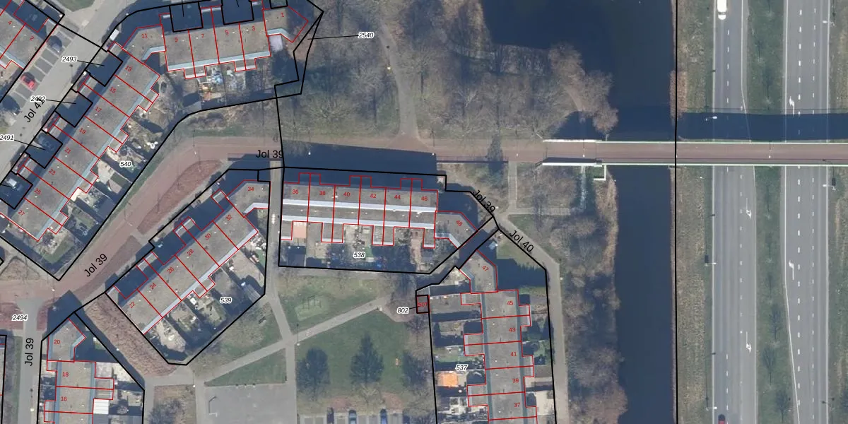 Jol 39 46 is gelegen op kadastraal perceel LLS00N538. Deze kadastrale aanduiding is uniek en wordt gebruikt door het Kadaster om eigendomsrechten en andere zakelijke rechten vast te leggen. Het perceel maakt onderdeel uit van de kadastrale gemeente Lelystad.