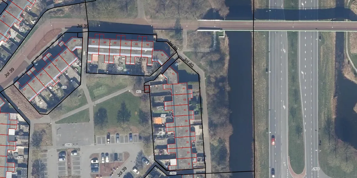 Jol 40 45 is gelegen op kadastraal perceel LLS00N537. Deze kadastrale aanduiding is uniek en wordt gebruikt door het Kadaster om eigendomsrechten en andere zakelijke rechten vast te leggen. Het perceel maakt onderdeel uit van de kadastrale gemeente Lelystad.