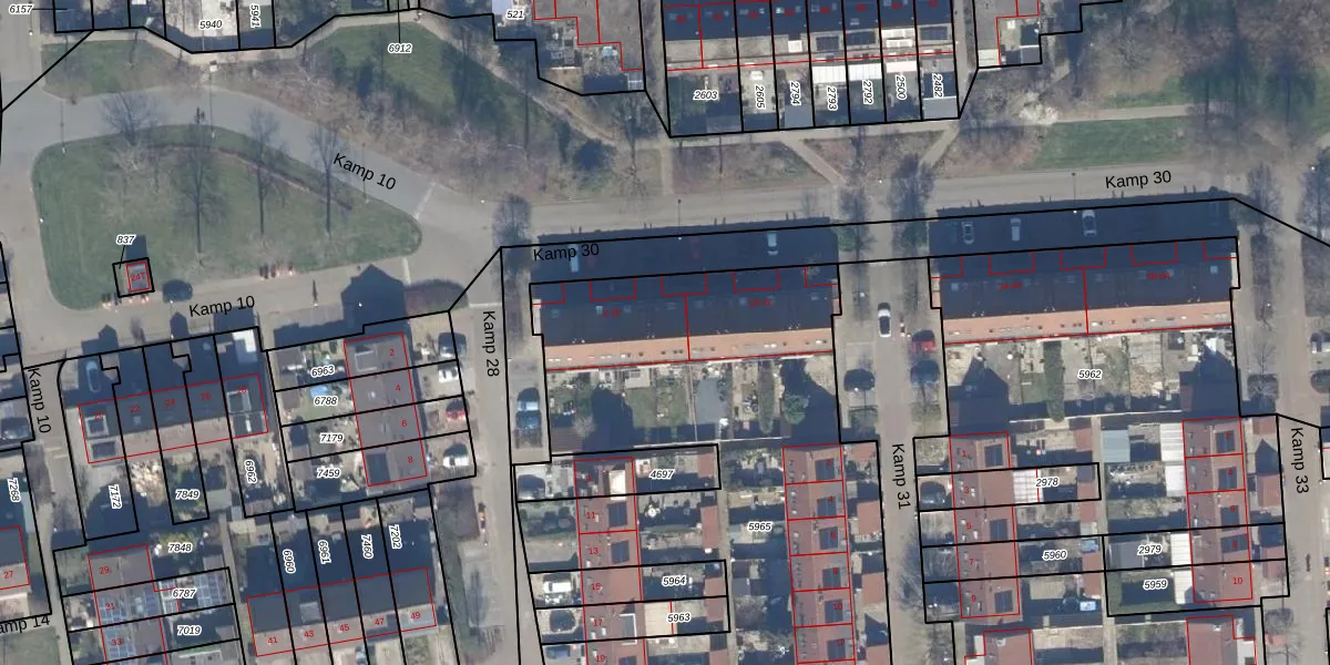 Het perceel waarop Kamp 30 16 staat heeft een oppervlakte van 3953 m². Dit is een zeer groot perceel. De perceeloppervlakte wordt geregistreerd door het Kadaster. Gedetailleerde informatie over de maten van dit perceel kunt u vinden in het rapport Kadastrale kaart met maatvoering van Kamp 30 16.