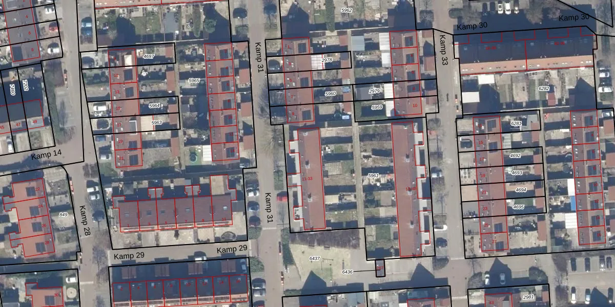Het perceel waarop Kamp 31 13 staat heeft een oppervlakte van 2037 m². Dit is een zeer groot perceel. De perceeloppervlakte wordt geregistreerd door het Kadaster. Gedetailleerde informatie over de maten van dit perceel kunt u vinden in het rapport Kadastrale kaart met maatvoering van Kamp 31 13.