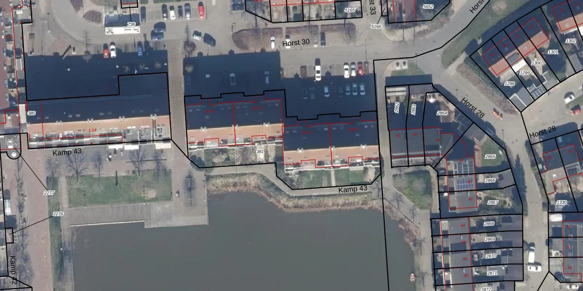 Kamp 43 44 is gelegen op kadastraal perceel LLS00P381. Deze kadastrale aanduiding is uniek en wordt gebruikt door het Kadaster om eigendomsrechten en andere zakelijke rechten vast te leggen. Het perceel maakt onderdeel uit van de kadastrale gemeente Lelystad.