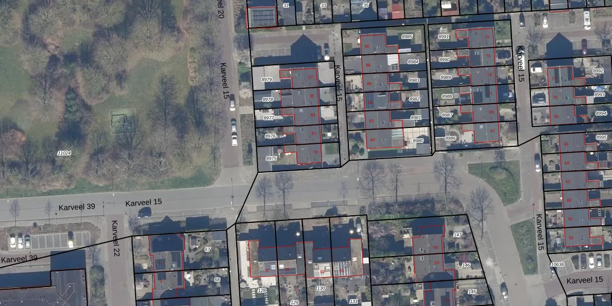Het perceel waarop Karveel 15 79 staat heeft een oppervlakte van 226 m². Dit is een middelgroot perceel. De perceeloppervlakte wordt geregistreerd door het Kadaster. Gedetailleerde informatie over de maten van dit perceel kunt u vinden in het rapport Kadastrale kaart met maatvoering van Karveel 15 79.