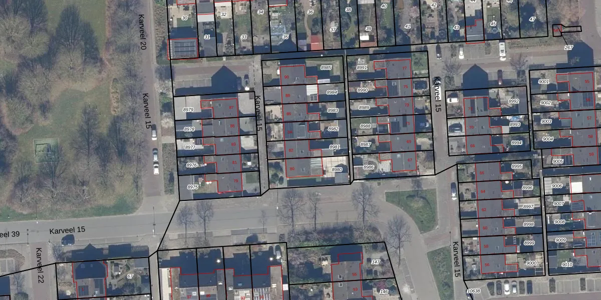 Het perceel waarop Karveel 15 82 staat heeft een oppervlakte van 165 m². Dit is een middelgroot perceel. De perceeloppervlakte wordt geregistreerd door het Kadaster. Gedetailleerde informatie over de maten van dit perceel kunt u vinden in het rapport Kadastrale kaart met maatvoering van Karveel 15 82.