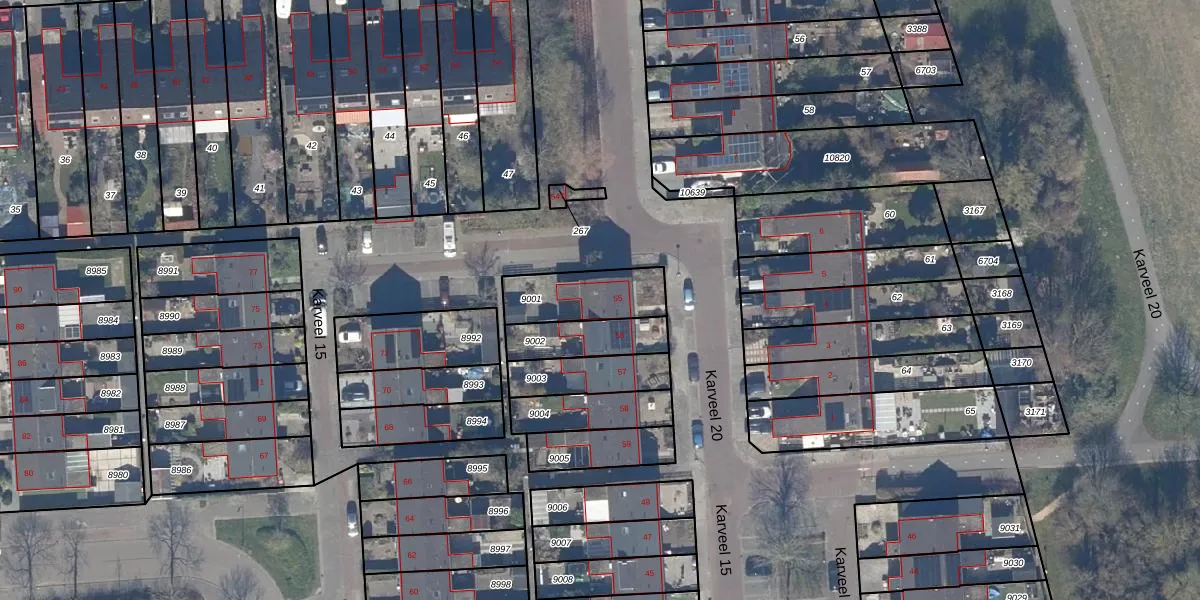 Het perceel waarop Karveel 20 55 staat heeft een oppervlakte van 221 m². Dit is een middelgroot perceel. De perceeloppervlakte wordt geregistreerd door het Kadaster. Gedetailleerde informatie over de maten van dit perceel kunt u vinden in het rapport Kadastrale kaart met maatvoering van Karveel 20 55.
