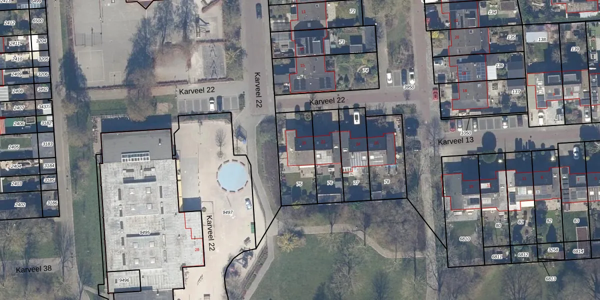 Karveel 22 20 is gelegen op kadastraal perceel LLS00M75. Deze kadastrale aanduiding is uniek en wordt gebruikt door het Kadaster om eigendomsrechten en andere zakelijke rechten vast te leggen. Het perceel maakt onderdeel uit van de kadastrale gemeente Lelystad.
