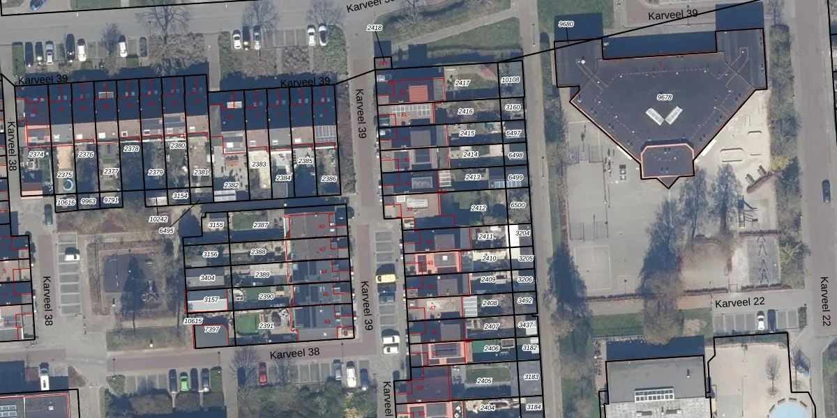Karveel 39 39 is gelegen op kadastraal perceel LLS00M2412. Deze kadastrale aanduiding is uniek en wordt gebruikt door het Kadaster om eigendomsrechten en andere zakelijke rechten vast te leggen. Het perceel maakt onderdeel uit van de kadastrale gemeente Lelystad.