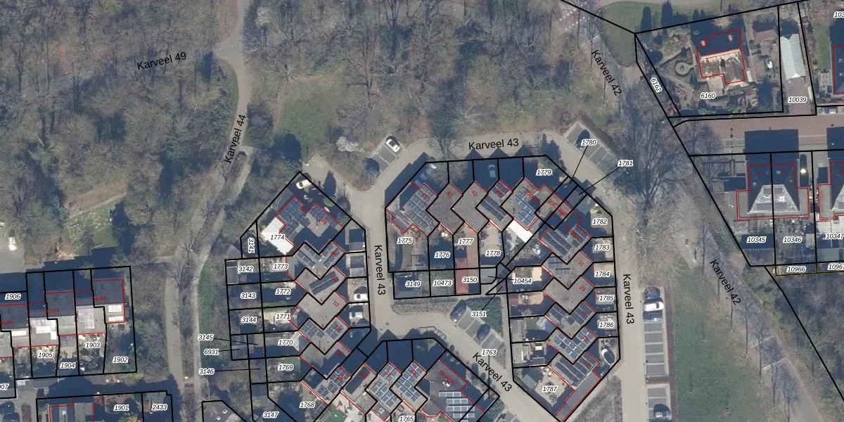 Het perceel waarop Karveel 43 45 staat heeft een oppervlakte van 249 m². Dit is een middelgroot perceel. De perceeloppervlakte wordt geregistreerd door het Kadaster. Gedetailleerde informatie over de maten van dit perceel kunt u vinden in het rapport Kadastrale kaart met maatvoering van Karveel 43 45.